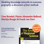 New paper has been published: Tom Broekel, Pierre-Alexandre Balland, Martijn Burger, Frank van Oort (2014) Modeling knowledge networks in economic geography: a discussion of four methods. Annals of Regional Science, DOI:DOI: 10.1007/s00168-014-0616-2